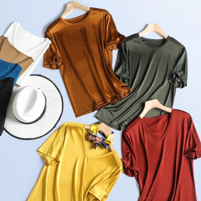100 % ORGANIC MULBERRY SILK TRI-ACETATE WRINKLE FREE V NECK TEE - WHITE