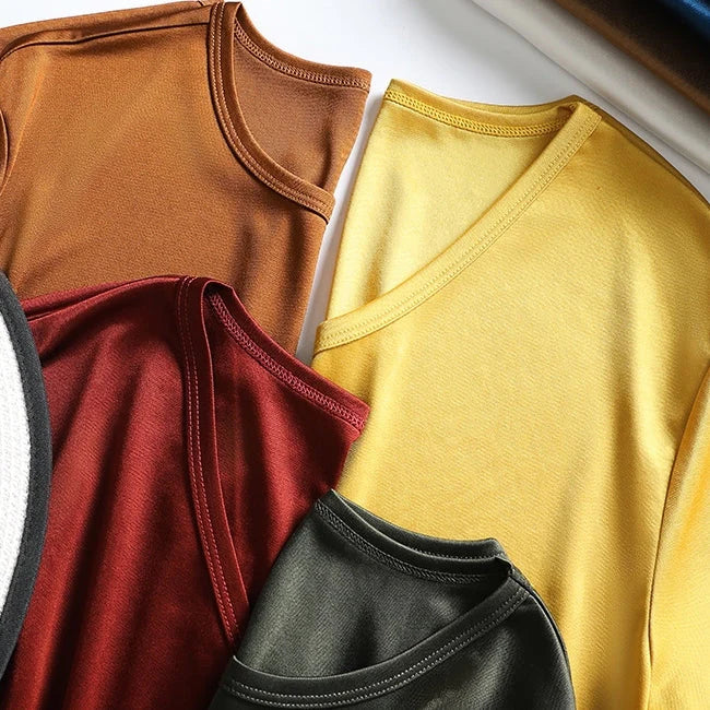 100 % ORGANIC MULBERRY SILK TRI-ACETATE WRINKLE FREE V NECK TEE - CARAMELBROWN