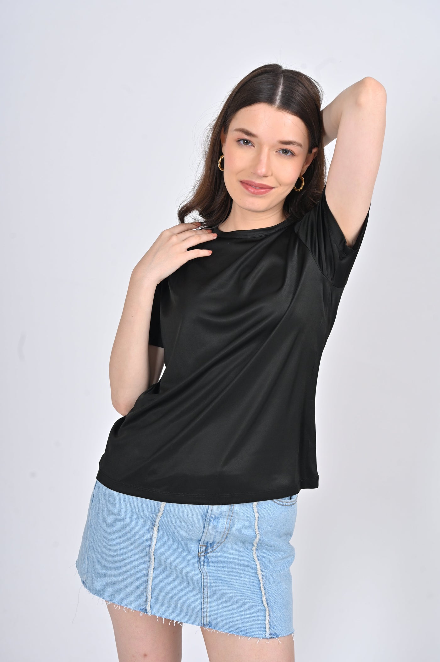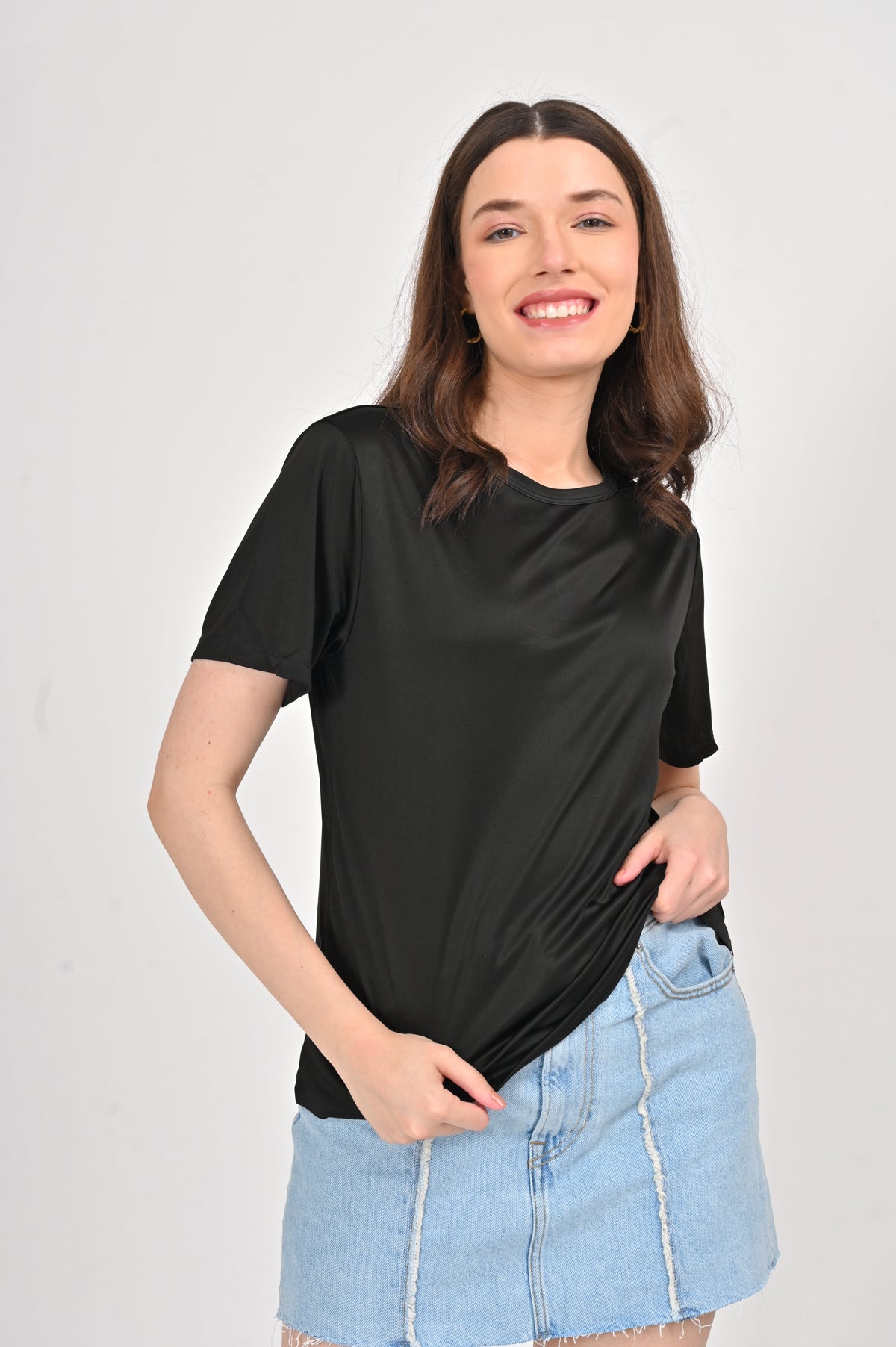100 % ORGANIC MULBERRY SILK TRI-ACETATE WRINKLE FREE ROUND NECK TEE - BLACK