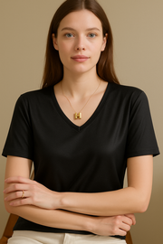 100 % ORGANIC MULBERRY SILK TRI-ACETATE WRINKLE FREE V NECK TEE - BLACK